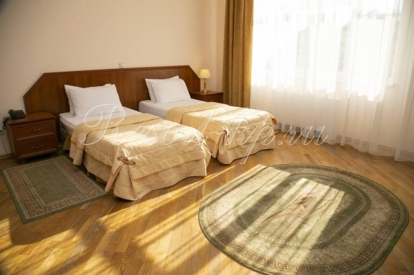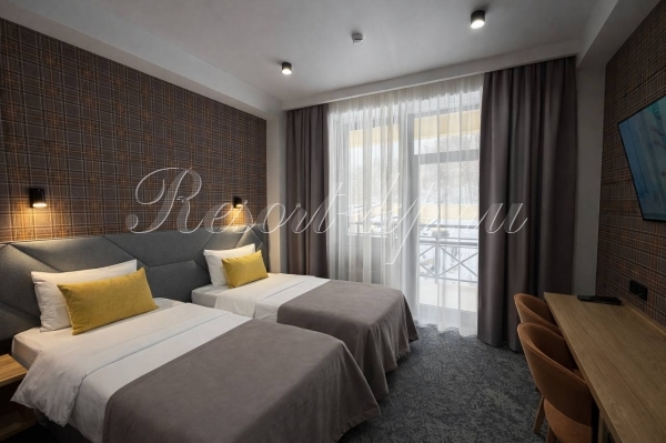 (36 номеров – 16 с раздельными кроватями; 20 с двуспальными, площадь 16 кв.м, вид из номеров на горы, балкон). В номерах: 2 раздельные кровати или 1 французская кровать, тумбочки, телевизор, холодильник, система кондиционирования, душевая кабина, унитаз, умывальник, фен, косметические принадлежности. |
